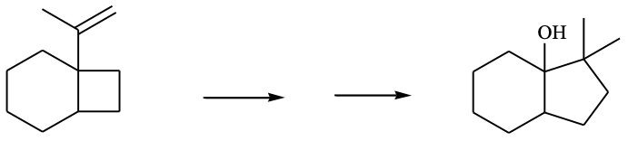 Si tratta di una reazione di alcheni con acqua in presenza di un catalizzatore acido. Gli elettroni pi-greco del doppio legame attaccano l’idrogeno dello ione idronio, di conseguenza si rompe il legame H-O portando alla formazione di un carbocatione terziario che va incontro a trasposizione (traspone un legame) formando un ciclo a 5 termini che risulterà più stabile di uno a 4 termini poiché l’espansione dell’anello fa diminuire la tensione angolare. A questo punto una coppia di elettroni dell’acqua attacca il carbocatione portando alla formazione di uno ione alchilossonio che reagirà con una nuova molecola d’acqua. In particolare una coppia di elettroni attacca l’idrogeno che di conseguenza rompe il legame con l’ossigeno, formando in questo modo il prodotto finale (un alcol) + H3O+