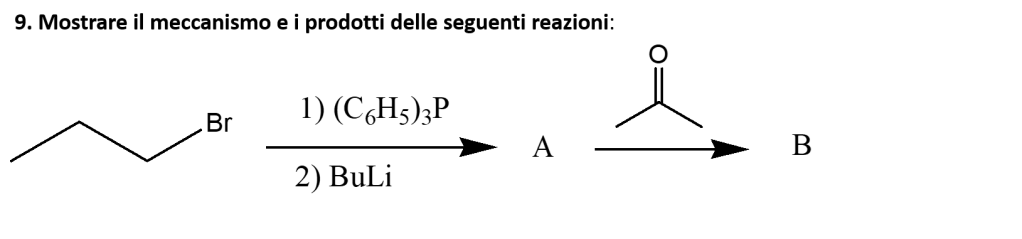 1-bromopropano reagisce con trifenilfosfina in un meccanismo SN2, successivamente ci sarà la reazione con BuLi per formare un ilide di fosfonio (C6H5)3P=CHCH2CH3. Questo reagisce con il propanone formando il 2-metil-2-pentene più trifenilfosfina ossido.