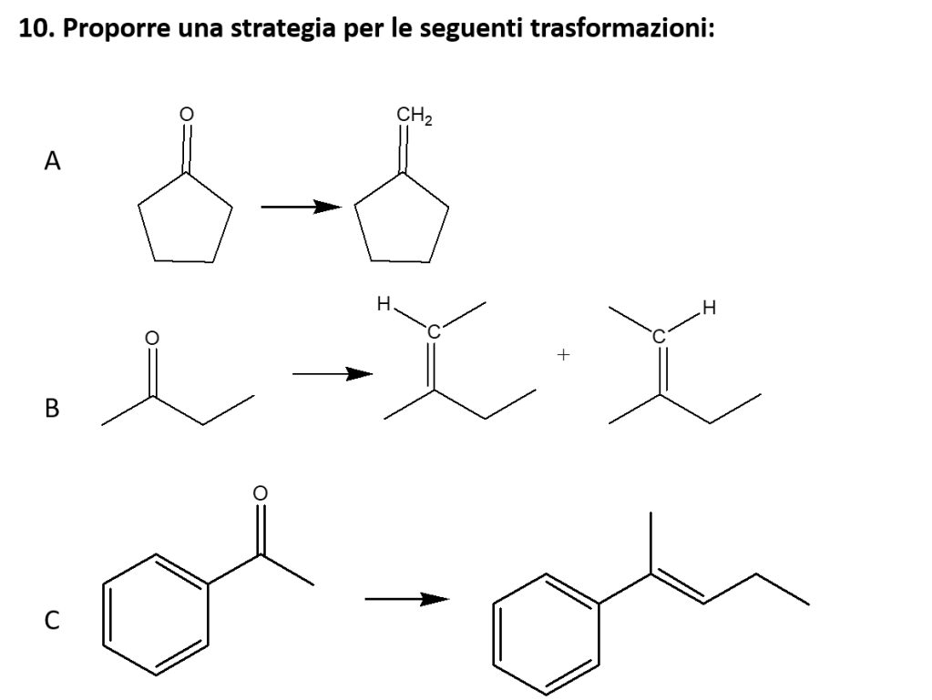 B. 2-butanone + (C6H5)3P=CHCH3 → 3-metil-2-pentene. La reaziode di Wittig per alcheni interni prevede la formazione di una miscela di E e Z
