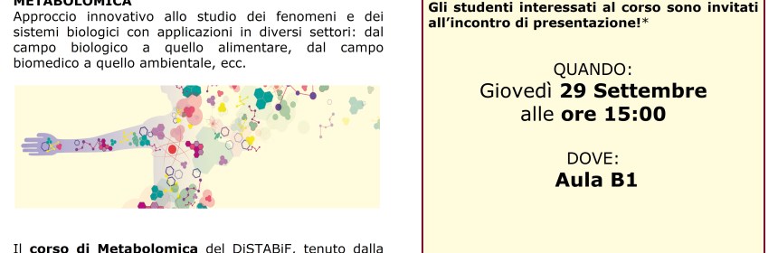 Il giorno 29/09 alle 15:00 si terrà un incontro preliminare di presentazione del CORSO DI METABOLOMICA (insegnamento a scelta – CdLM in Biologia). L’incontro si terrà in aula B1, ma sarà possibile anche partecipare online (sarà necessario contattare il docente per poter essere aggiunti all’aula virtuale). Nel corso dell’incontro saranno definite anche le modalità e gli orari delle lezioni.