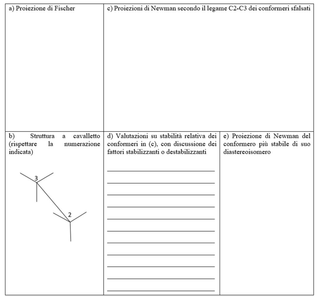 6) Prendere in considerazione il (2R,3R)-2-bromo-3-esanolo e completare la seguente tabella, disegnando o scrivendo quanto richiesto in ogni cella