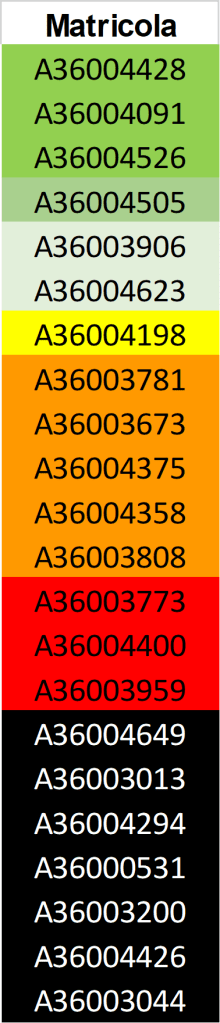 Gli studenti indicati in verde hanno superato la prova e sono ammessi alla prova orale. Lo studente in giallo è ammesso con riserva all’orale.