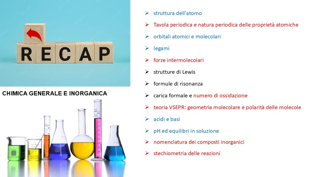 A beneficio di tutti, di seguito è riportata la slide mostrata oggi a lezione in cui in nero sono riportati gli argomenti che abbiamo visto/vedremo insieme, in rosso sono riportati gli argomenti che gli studenti devono rivedere in maniera autonoma, in blu quegli argomenti per i quali abbiamo fatto/faremo una (veloce) ricapitolazione.