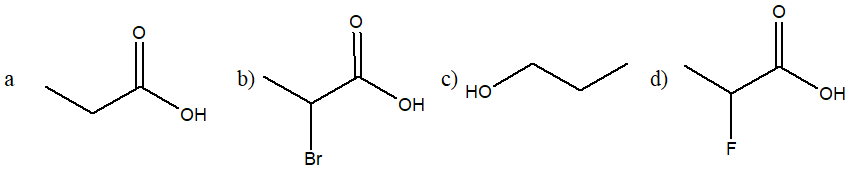 d) CH3CHFCH2COOH e) CH3CHBrCH2COOH f) CH3CH2CH2CH2OH