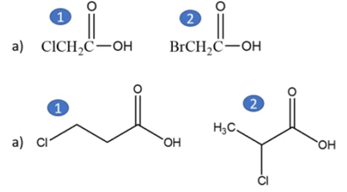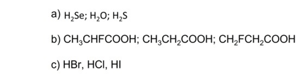 a) CH3CH2CH2COOH b) CH3CH2CHBrCOOH c) CH3CH2CBr2COOH