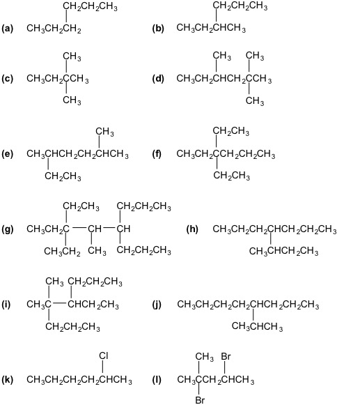 | (a) 1,3-dimetilbutano (b) 4-metilpentano (c) 2,2-dietilbutano (d) 2-etil-metilpentano (e) 4,4-dimetilesano (f) 2-propilpentano | (g) 2,2-dietileptano (h) 5-butilottano (i) 2,2-dimetilciclopropano (j) 2-sec-butilottano (k) 4-isopentileptano (l) 1,3-dimetil-6-etilcicloesano |