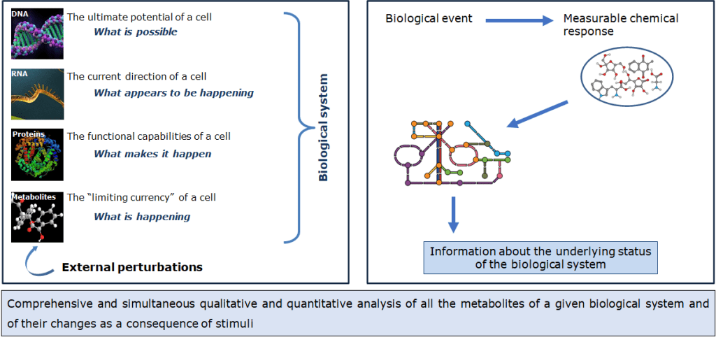 Del resto, la metabolomica si colloca all’interfaccia tra la chimica e la biologia, in quanto ciascun fenomeno biologico produrrà una risposta chimica misurabile e la determinazione delle variazioni osservate fornirà informazioni sullo stato del sistema biologico in analisi. Inoltre, andando a misurare quelli che sono i prodotti finali dell’espressione genica, ossia i metaboliti, fornisce informazioni essenziali su quello che è il fenotipo e la relazione di quest’ultimo col genotipo.