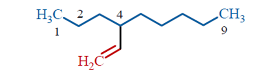 Ad esempio, il composto che segue, si chiama 4-etenilnonano: la catena più lunga è a 9 atomi di carbonio e non contiene il doppio legame. La porzione della molecola che contiene il doppio legame è dunque un sostituente, per il quale si usa il suffisso “-enil” (per indicare con “-en-” anche la presenza del doppio legame).