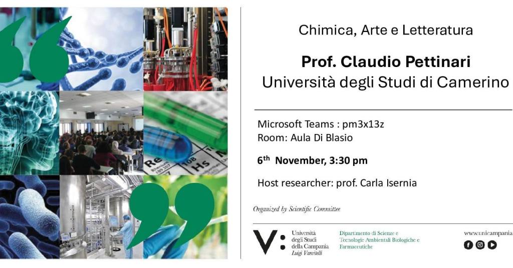 Seminario: Chimica, Arte e Letteratura Posted on Nov 5, 2024 by monicascognamiglio Share this: Click to share on X (Opens in new window) X Click to share on Facebook (Opens in new window) Facebook Like Loading... tagged with News Avvisi
