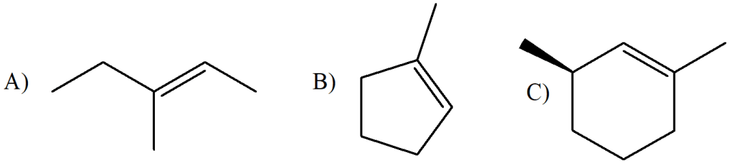 3) Mostrare il meccanismo e scrivere il/i prodotto/i di ossimercuriazione/riduzione per le seguenti molecole: