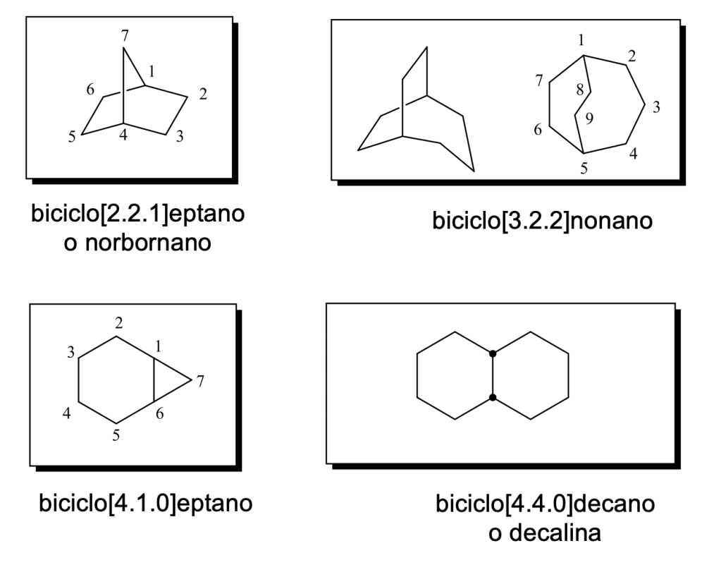 Questi composti sono chiamati biciclo[x.y.z]alcani, dove x, y e z rappresentano il numero di atomi di carboni di ogni catena carboniosa che congiunge a con b, elencati in ordine decrescente; alcano rappresenta il numero totale di carboni nella molecola.