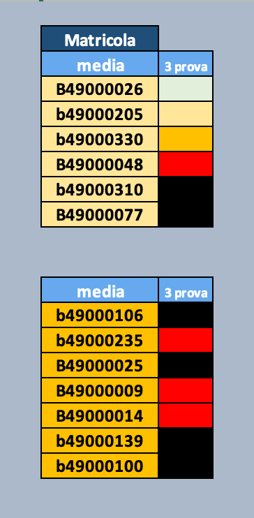 Gli studenti identificati dai colori giallo e arancione hanno superato con riserva. Anche gli studenti che hanno superato con riserva sono ammessi a sostenere la quarta prova intercorso. I risultati della terza prova sono indicati nella seconda colonna; nella prima la media delle tre prove.