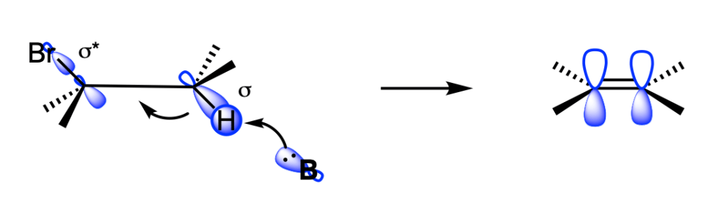 In una reazione di eliminazione, l’alogeno è eliminato insieme a un idrogeno dal carbonio adiacente (carbonio beta). L’idrogeno viene strappato da una base.