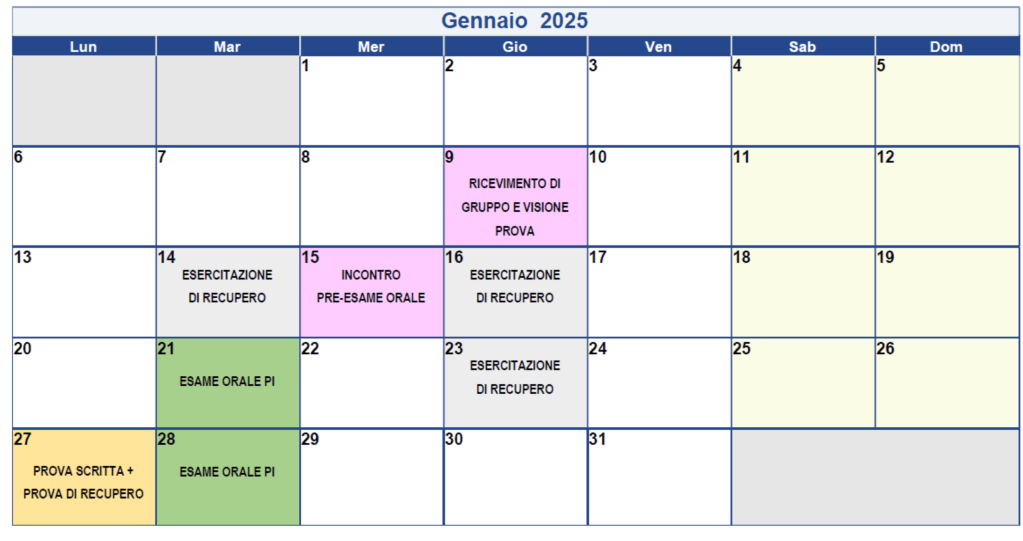 Le date in verde sono destinate agli esami orali per gli studenti che hanno superato le prove intercorso (e coloro che supereranno la prova di recupero). La prenotazione sarà possibile a partire da giovedì 28 dicembre alle 00:00. Per ogni data è previsto un numero massimo di 8 prenotati. La prenotazione per più date è assolutamente vietata. In caso di prenotazioni multiple, saranno eliminate tutte le prenotazioni dello studente in questione.