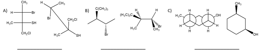2. Dire se le strutture riportate a destra sono isomeri conformazionali, isomeri geometrici, isomeri ottici, isomeri costituzionali, o lo strutture identiche rispetto alla seguente struttura a segmenti: