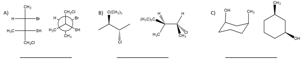2. Stabilire le configurazioni assolute dei carboni chirali presenti nelle seguenti molecole (NB: la notazione va riportata vicino ai carboni cui fa riferimento) e dire qual è la relazione stereochimica esistente tra i composti di ciascuna coppia (isomeri conformazionali/enantiomeri/diastereoisomeri/stesso composto/altro):