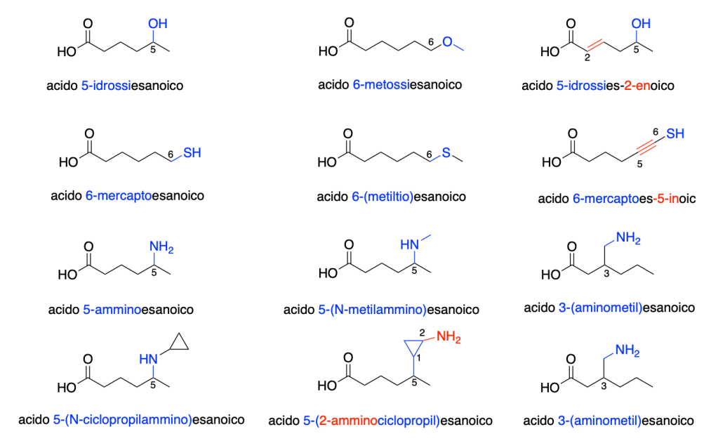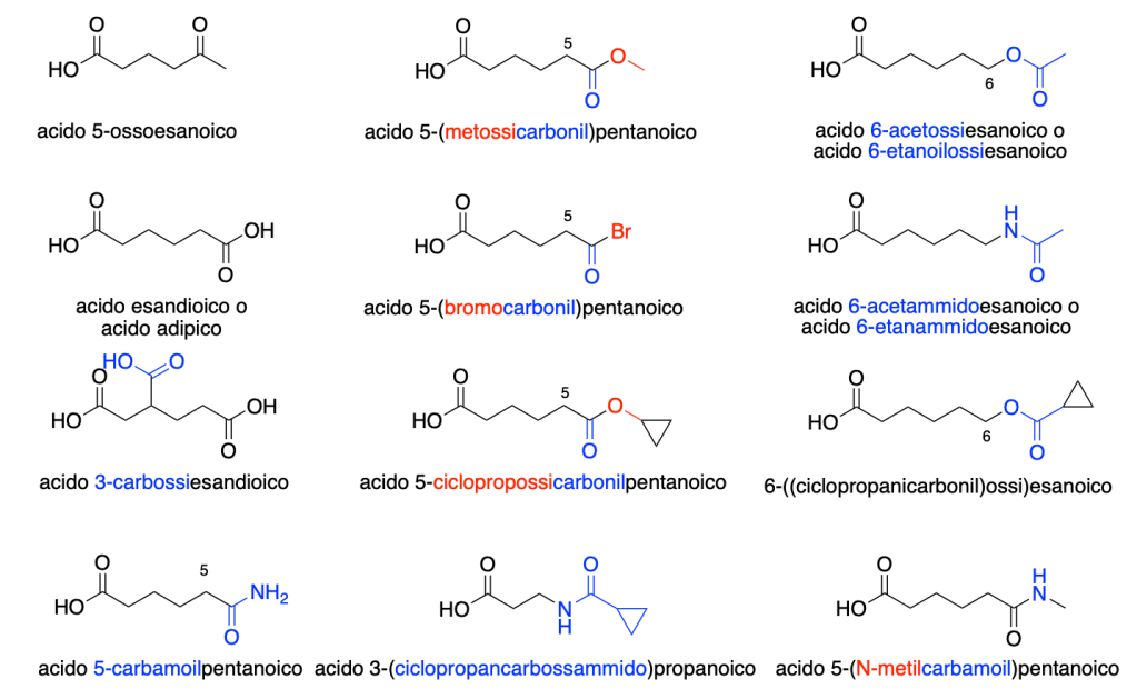Ognuno di questi acidi contiene più gruppi funzionali. Poiché il gruppo carbossile è prioritario, la catena più lunga deve contenre il gruppo carbossilico; inoltre, bisogna numerare dall’estremità più vicina al gruppo funzionale prioritario.