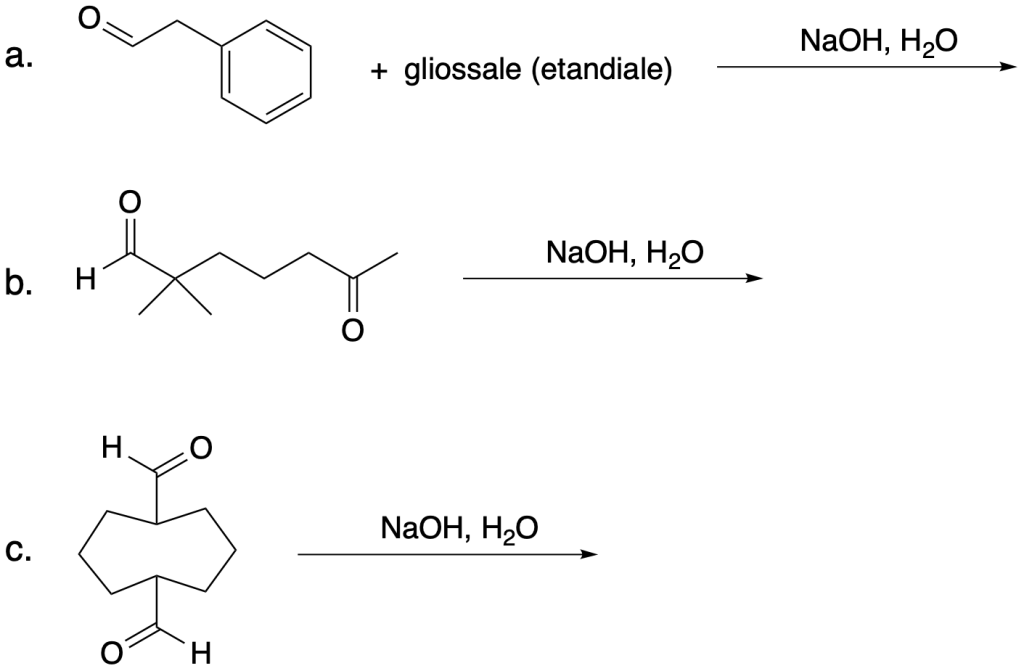 Scrivere le strutture dei prodotti principali attesi dalla reazione tra benzaldeide (in eccesso) e i seguenti composti: