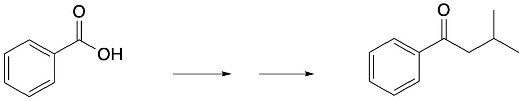 Mostrare come convertire l’acido benzoico in 3-metil-1-fenil-1-butanone usando una condensazione di Claisen in qualche stadio della sintesi: