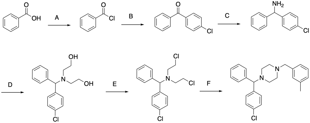 La meclizina è un antiemetico. Essa può essere prodotta attraverso la seguente serie di reazioni: