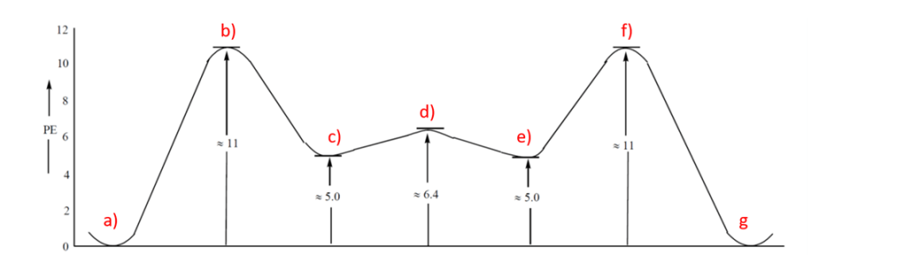 13. Dire quali conformeri del cicloesano corrispondono ai minimi e ai massimi di energia (a-g) in questo grafico: