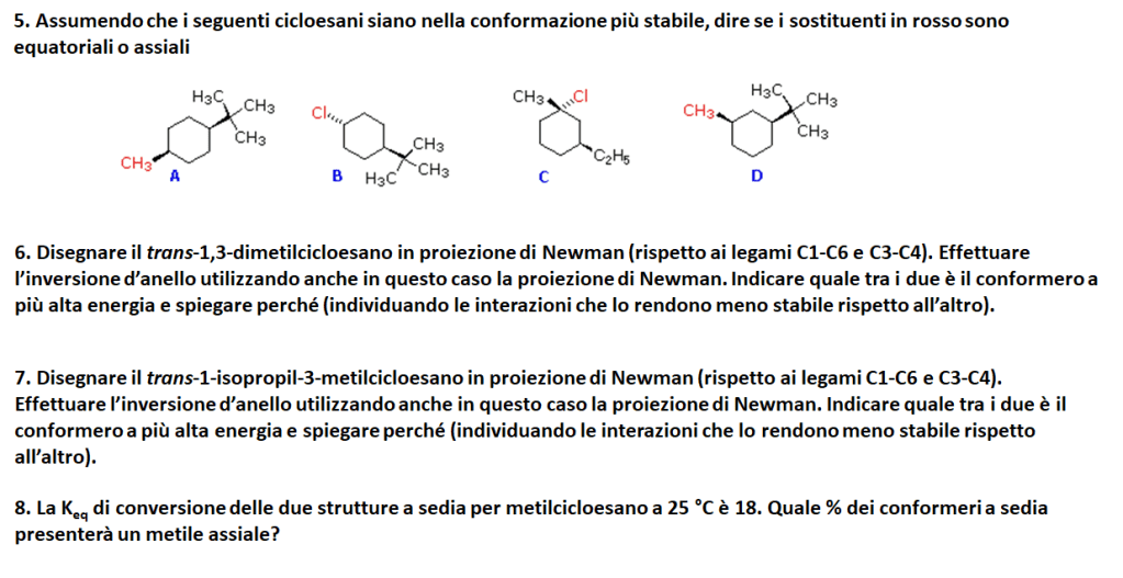 11. Scrivete il cicloesano trisostituito riportato in basso nelle due conformazioni a sedia indicando dov’è spostato l’equilibrio. Scrivete, inoltre le due conformazioni a sedia in proiezione di Newman guardando la molecola lungo i legami C4-C5 / C2-C1.