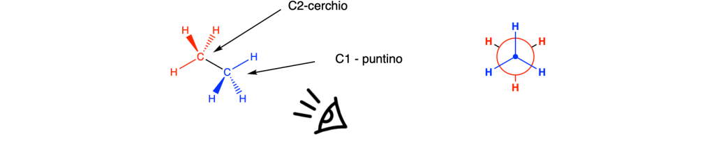 Nella proiezione di Newman, guardi il legame C-C come se tu fossi posizionato lungo la linea del legame, con il primo carbonio (C1) direttamente davanti a te e il secondo carbonio (C2) nascosto dietro di esso.