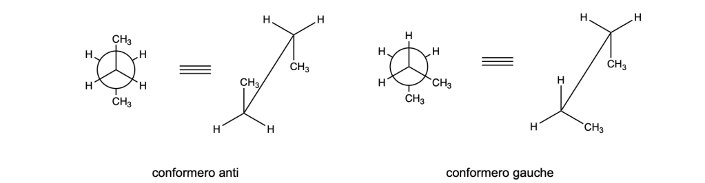 - Il conformero anti (o antiperiplanare) presenta due gruppi alchilici che formano un angolo diedro di 180° è più stabile del conformero gauche (angolo diedro 60°)a causa della tensione sterica