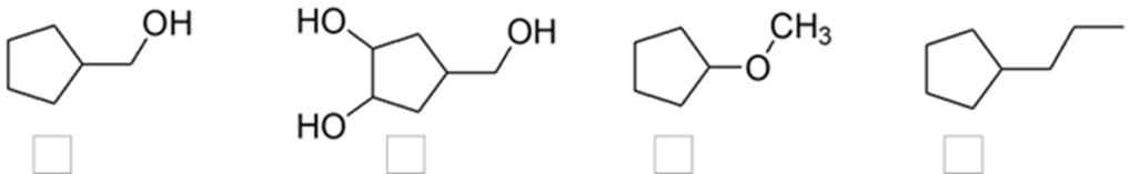 1. Disporre i seguenti composti in ordine di punto di ebollizione crescente. Indicare l’ordine inserendo i numeri nei riquadri sotto le strutture: 1= quello col punto di ebollizione più basso, 5= quello col punto di ebollizione più alto