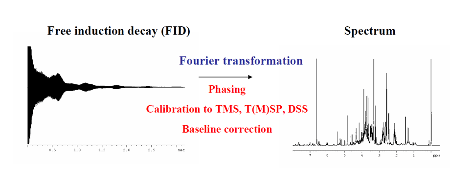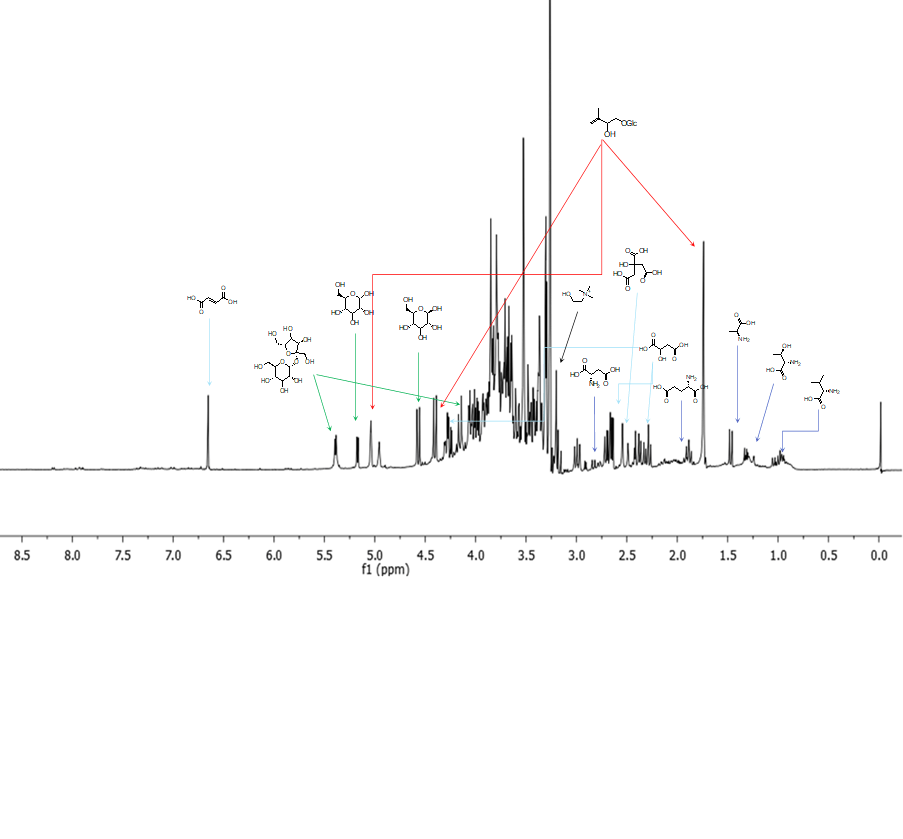A partire dal materiale liofilizzato, si ottengono gli estratti con una procedura molto semplice che prevede l’estrazione diretta in solventi deuterati (necessari per l’analisi NMR). Questi estratti vengono analizzati, ottenendo gli spettri, che saranno poi processati: questo processing prevede l’apodizzazione, la fasatura, la calibrazione rispetto allo standard intetno e la correzione della linea di base