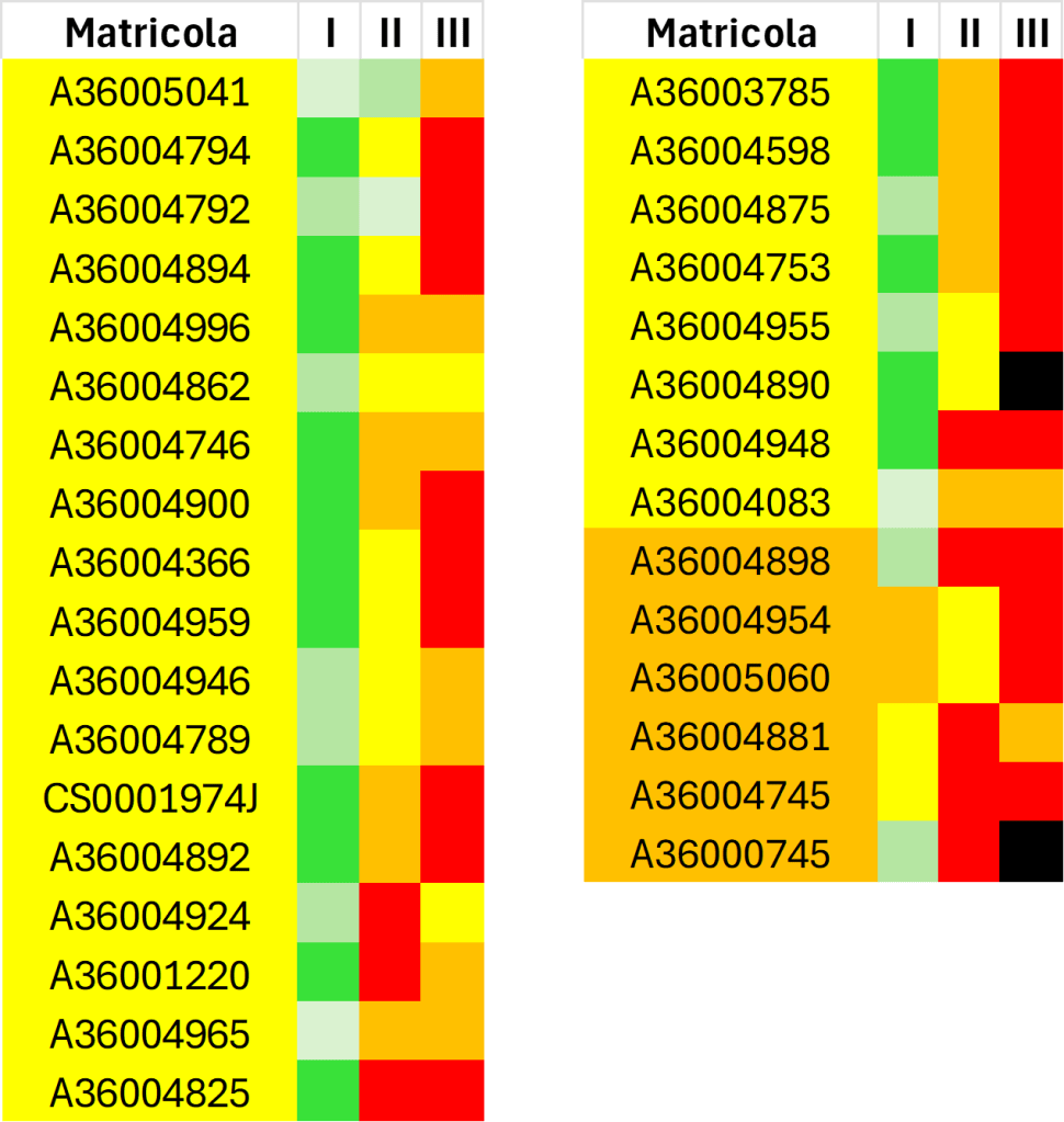 Si ricorda che il nero indica una insufficienza gravissima (voto minore/uguale a 6…e si ricorda che i voti sono espressi in trentesimi).