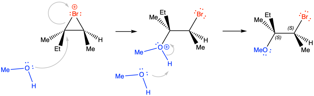 il carbonio che viene attaccato dal metanolo (conf. R) subisce inversione di configurazione con formazione del prodotto desiderato, il (2S,3S)-2-bromo-3-metil-3-metossipentano. L’attacco del bromo all’alchene dal basso, porterà alla formazione dell’enantiomero (2R,3R)-2-bromo-3-metil-3-metossipentano.