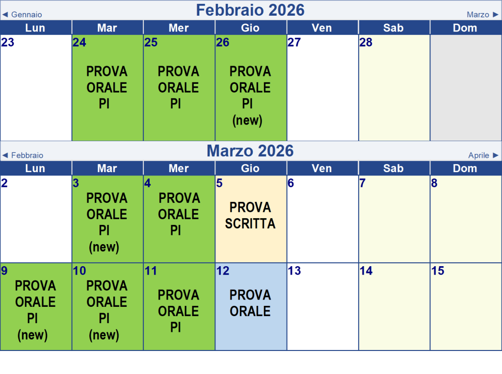 Gli esami orali cominceranno alle 14:30, se non diversamente indicato su esse3 e sul calendario degli appuntamenti settimanali.