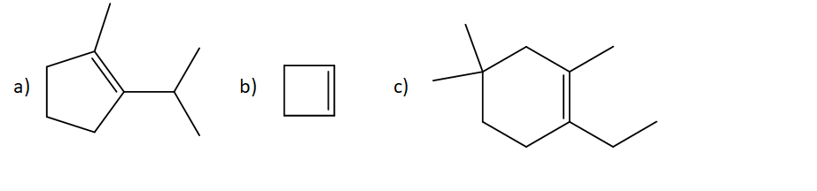 Mostrare il prodotto a) di idrogenazione catalitica; b) di ozonolisi dei seguenti alcheni. Quando opportuno, indicare la stereochimica dei prodotti: