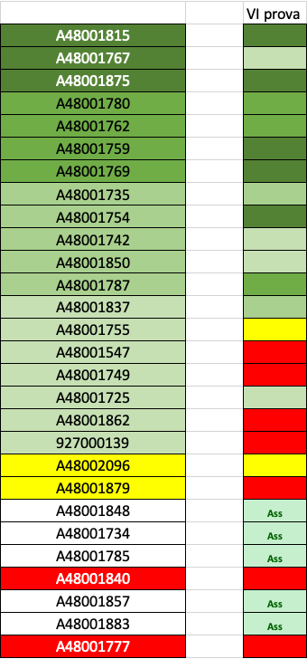 Di seguito sono riportati i risultati della prova in oggetto. In verde sono indicati tutti gli studenti che hanno superato la prova scritta (tonalità diverse indicano l’appartenenza a diverse fasce di voto).