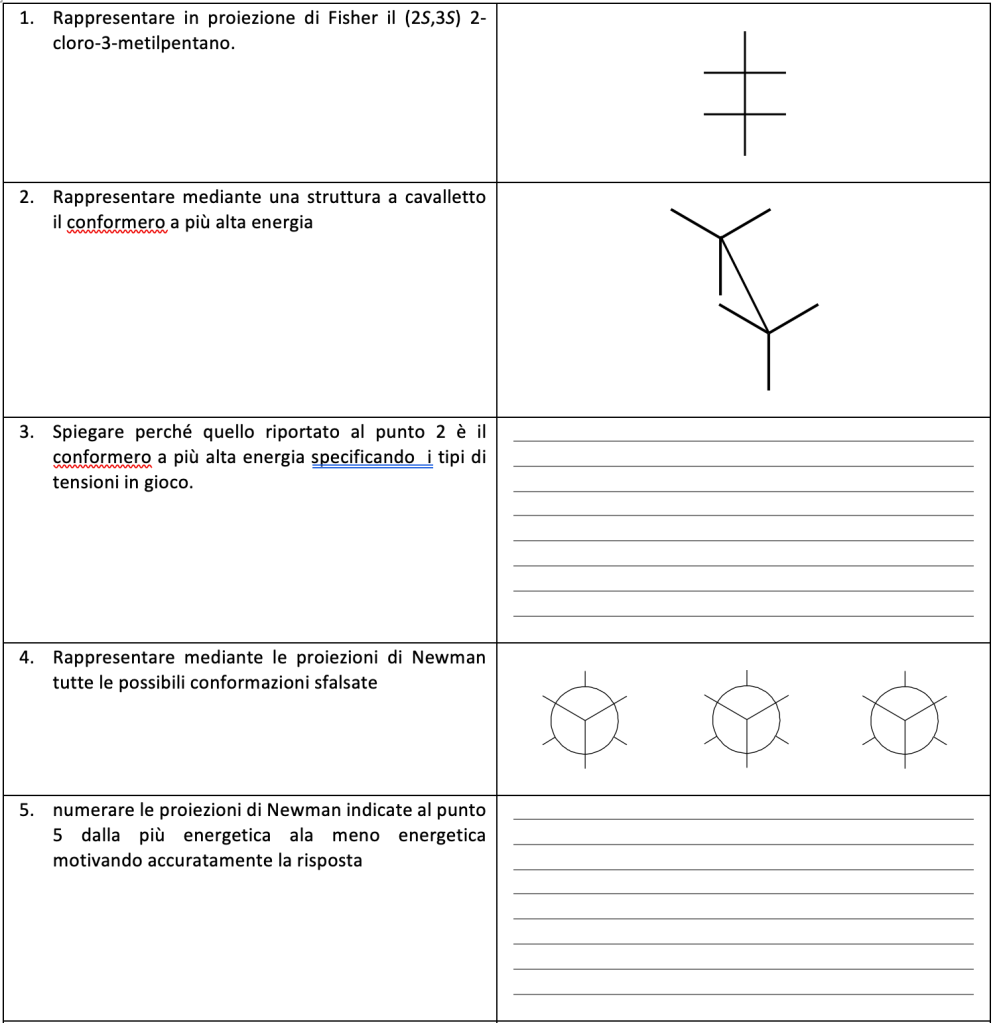 Determinare se le strutture scritte sotto con una simbologia diversa, corrispondono di volta in volta alla struttura inizialmente scritta o al suo enantiomero.