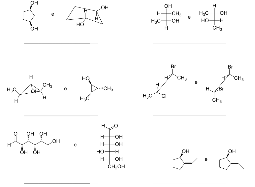 Per ognuna delle seguenti coppie di strutture indicare se i composti sono (a) identici (b) isomeri costituzionali (c) enantiomeri (d) diastereoisomeri (e) identici e composti meso (f) composti differenti non isomerici