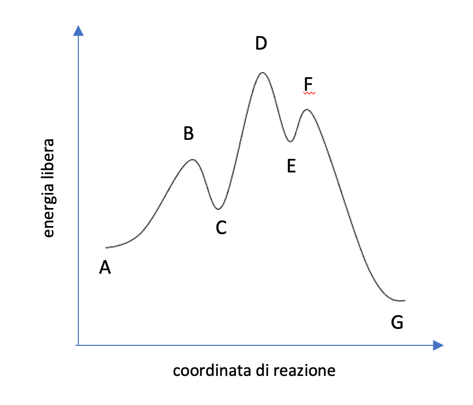 Osservando il seguente diagramma di energia potenziale /coordinata di reazione che da A porta a G, rispondi alle seguenti domande: