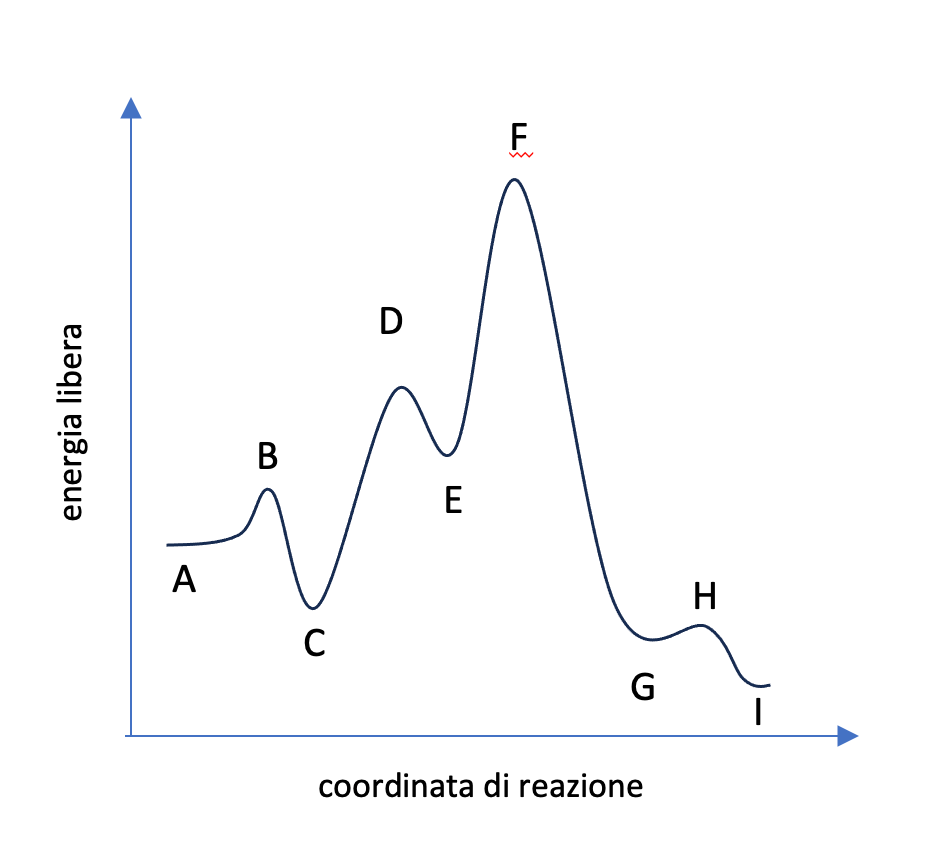 Osservando il seguente diagramma di energia potenziale /coordinata di reazione che da A porta a I, rispondi alle seguenti domande: