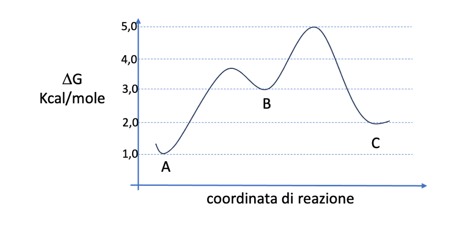 Disegna il diagramma dell’energia libera in funzione della coordinata di reazione per la seguente trasformazione, in cui C è il composto più stabile e B il meno stabile delle tre specie e lo stato di transizione da A a B è più stabile dello stato di transizione da B a C: