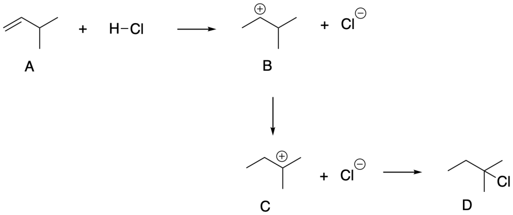 a. l’addizione di acido cloridrico al 3-metil-1-butene fornisce due prodotti: 2-cloro-3-metilbutano e 2-cloro-2-metilbutano