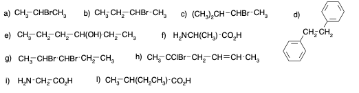 Quali tra i seguenti composti sono chirali? (indicare gli stereocentri); a) 2-metileptano; b) 3- metileptano; c) 4-metileptano; d) 1,1-dibromopropano; e) 1,3-dibromopropano; f) 1,2- dibromopropano; g) 2,3-dimetilpentano; h) metilcicloesano; i) 1,3-dimetilciclobutano;