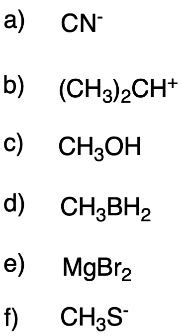 Identificate ciascuna delle specie seguenti come acido di Lewis o come base di Lewis e per ognuna scrivete un’equazione che mostri una reazione acido-base di Lewis. Utilizzate le frecce curve per rappresentare il movimento dei doppietti di elettroni. Controllate che il prodotto di ciascuna reazione sia rappresentato da una struttura di Lewis completa e corretta.