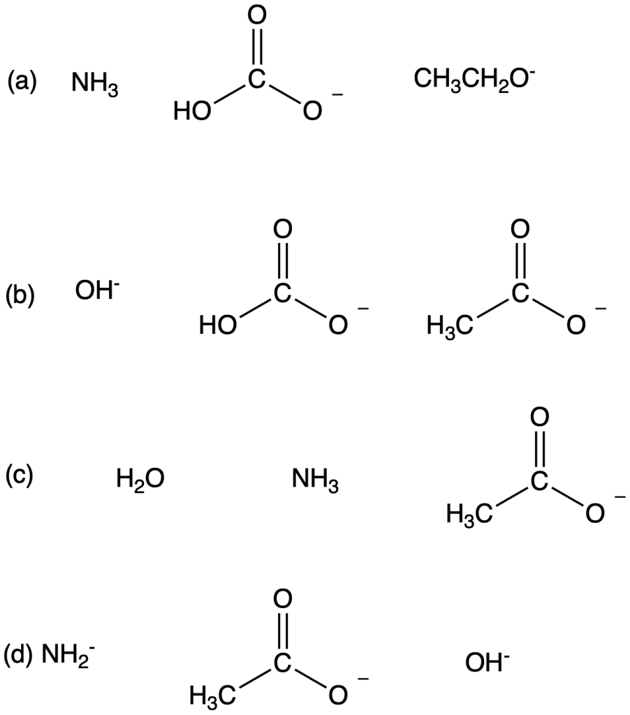 L’acido acetico è un acido organico debole, pKa 4,76. Scrivere l’equazione della reazione di equilibrio dell’acido acetico con ognuna delle seguenti basi. Indicare dov’è spostato l’equilibrio