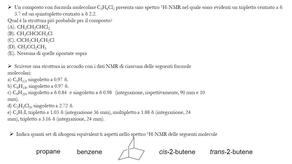 un utile link per esercizi NMR Spectroscopy Practice Problems https://www.chemistrysteps.com/nmr-spectroscopy-carbon-dept-ir-practice-problems/