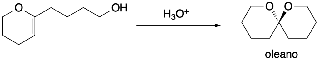 I feromoni sono composti organici importanti in agricoltura, in quanto rappresentano uno dei mezzi per attrarre e intrappolare gli insetti che potrebbero essere dannosi per i raccolti. L’oleano, il feromone sessuale per la mosca dell’ulivo, Dacus oleae, può essere sintetizzato dall’etere idrossienolico mostrato mediante trattamento di quest’ultimo con un acido.