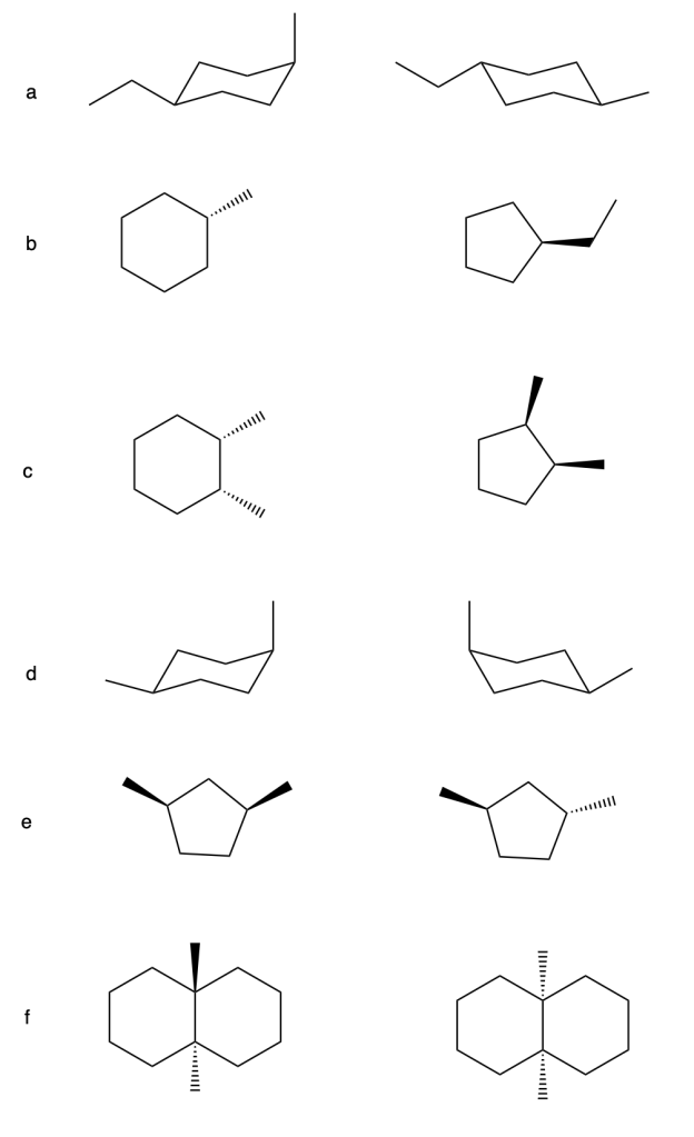 Converti i seguenti cicloesani nelle loro conformazioni a sedia. Stabilisci qual è la conformazione a più bassa energia facendo uso anche delle proiezioni di Newman: