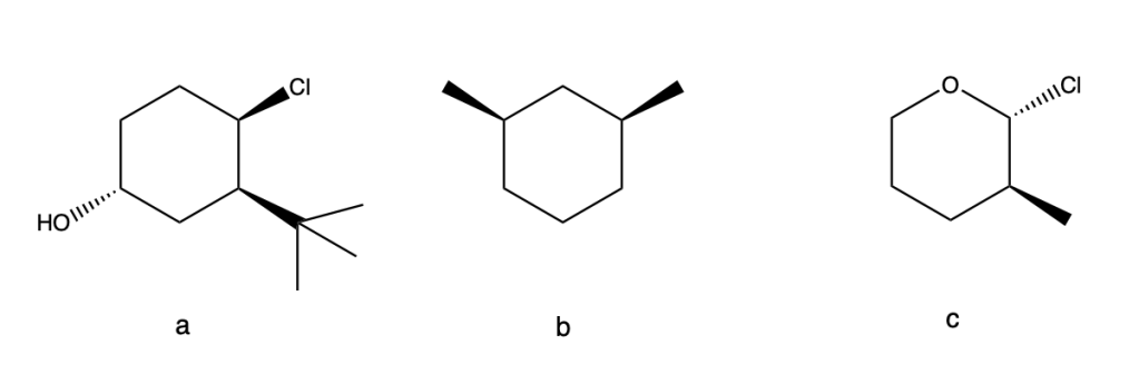 Per i seguenti composti, mostra due conformazioni a sedia, indicando quale delle due è più stabile. Illustrare i due conformeri anche mediante proiezioni di Newman: