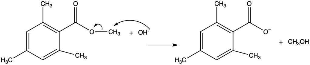 L’idrolisi basica del mesitoato di metile ha luogo attraverso un attacco promosso dallomione alcossido a livello del carbonio alcolico anzicchè acilico. Quale potrebbe essere una motivazione che giustifichi questo comportamento inusuale?