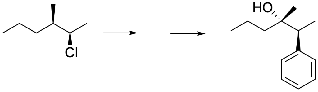 Partendo dall’opportuno stereoisomero del 3-metil-2-pentene, illustrare il meccanismo di reazione della sintesi del seguente composto. Indicare eventuali altri prodotti fornendo per tutti il nome IUPAC completo di stereochimica